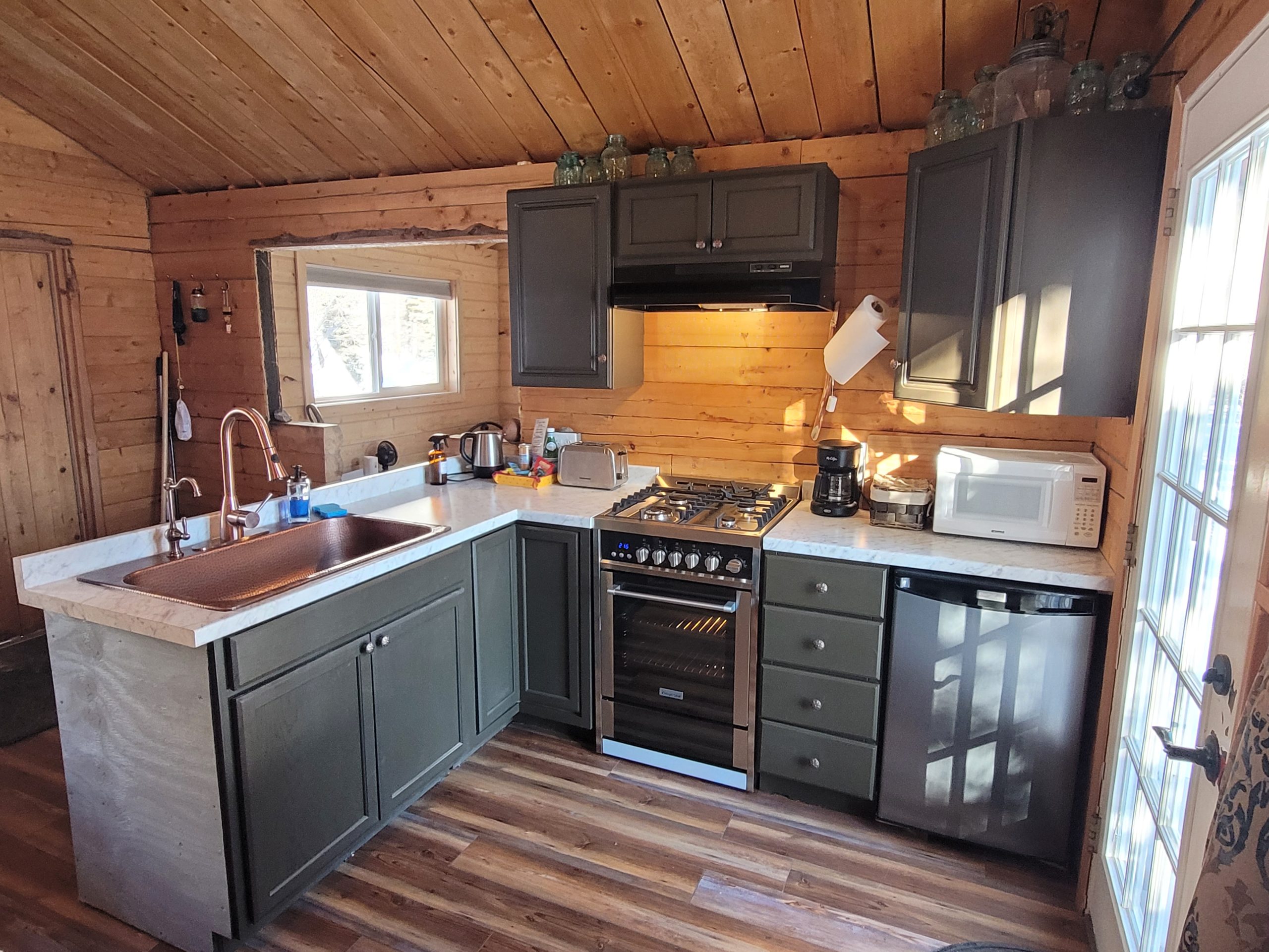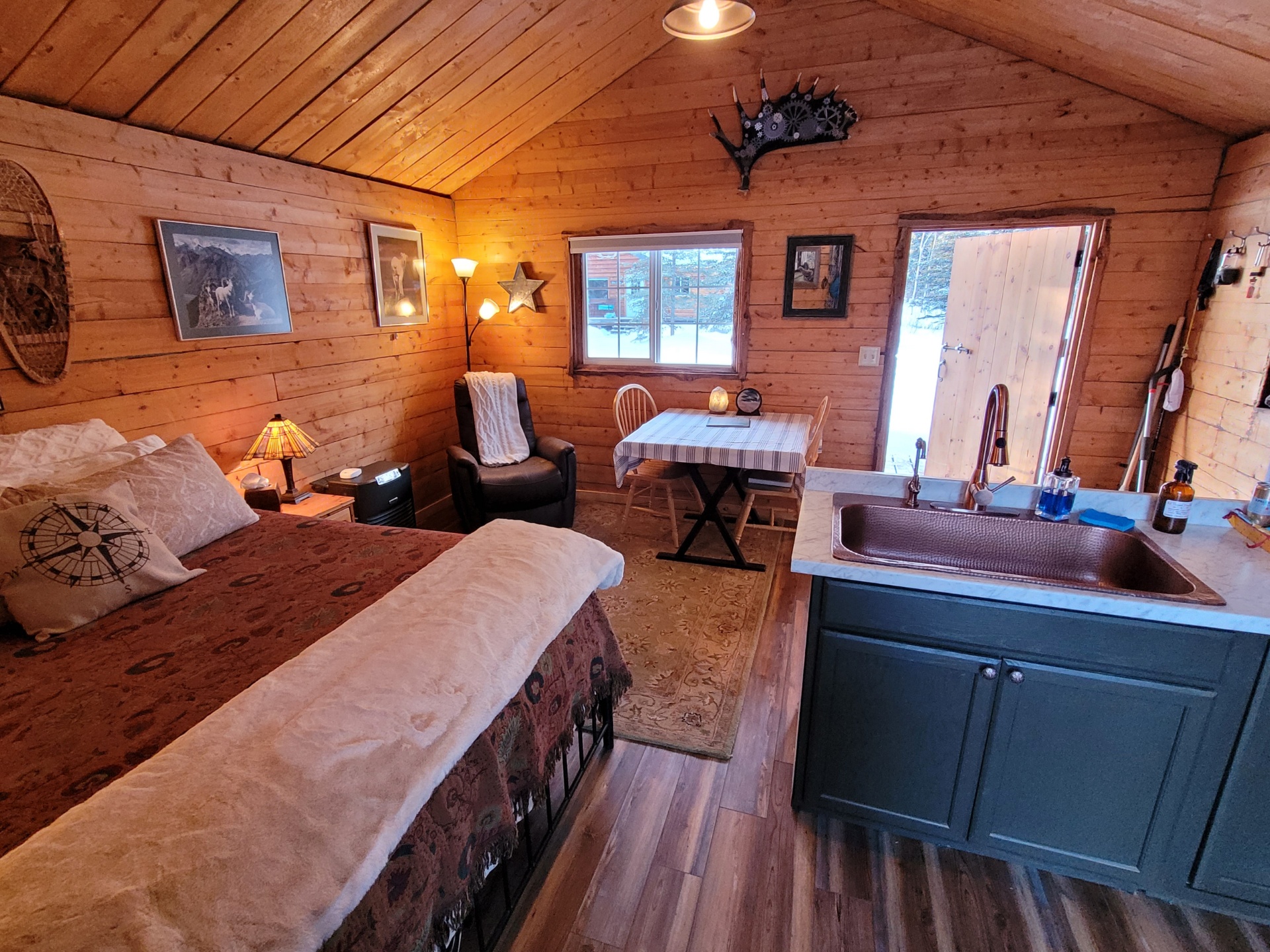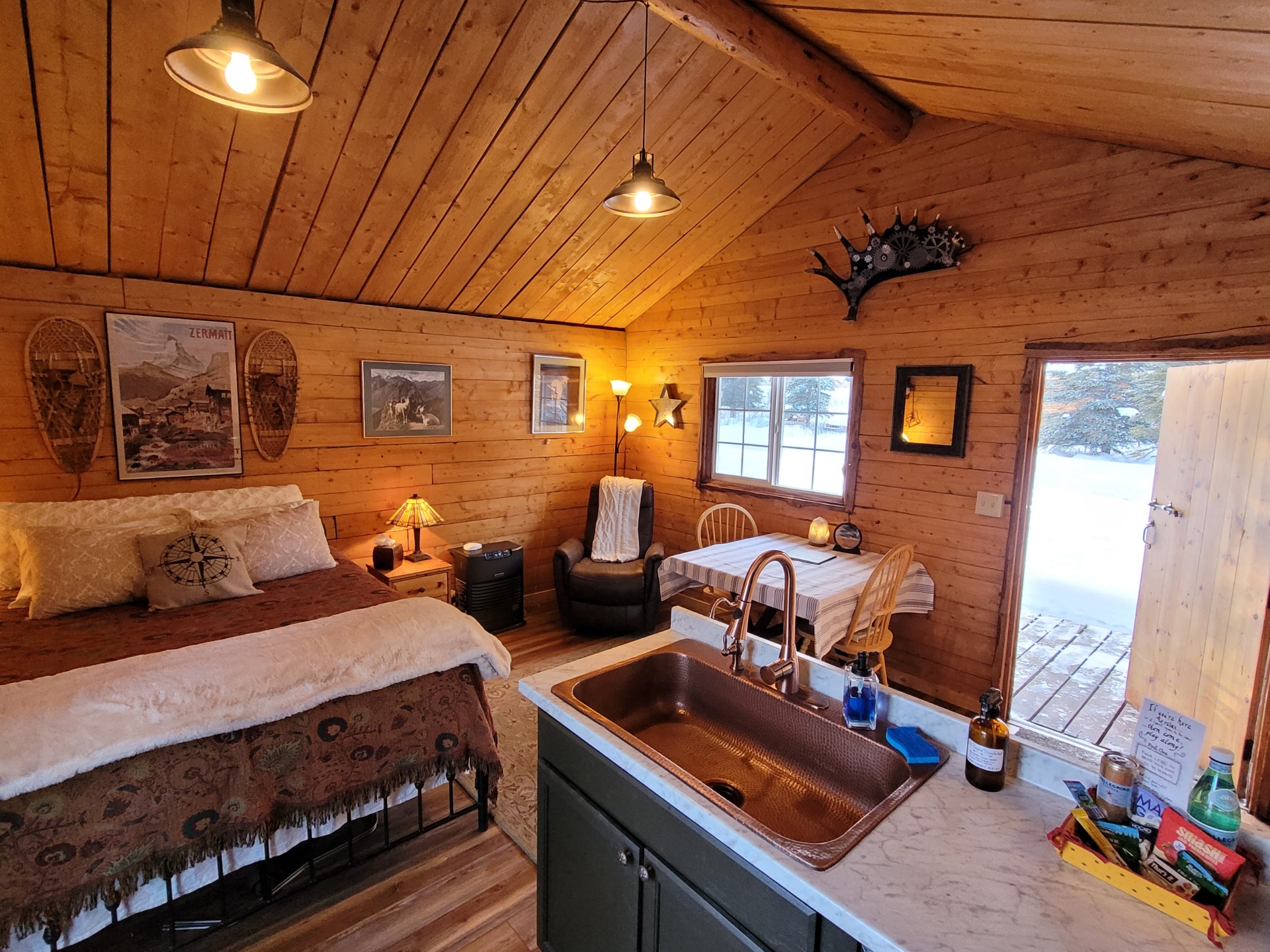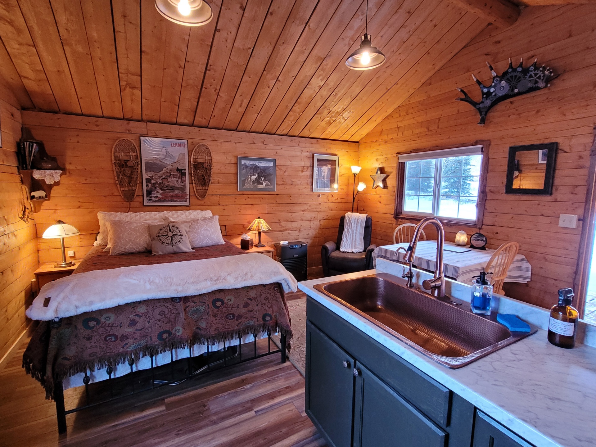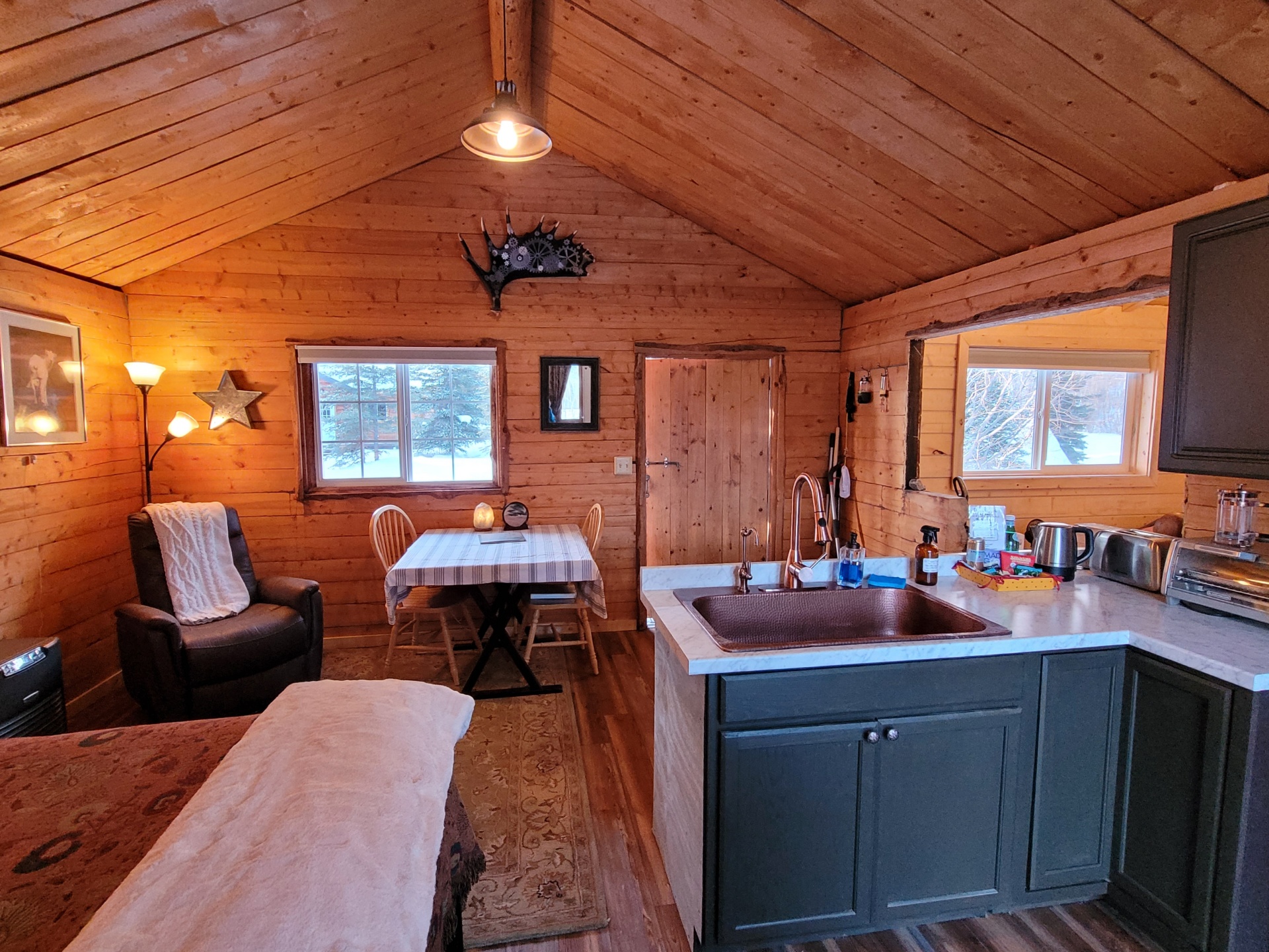 The Polaris has a fully equipped kitchen with a sink, reverse osmosis drinking water tap, microwave, mini fridge, propane cook stove and oven, dish-ware, utensils, and pots and pans. Enjoy the newly completed ensuite bathroom with shower and tub, flush toilet and vanity sink! Heated with a Toyo stove. Extra linens, blankets, and bath towels provided.