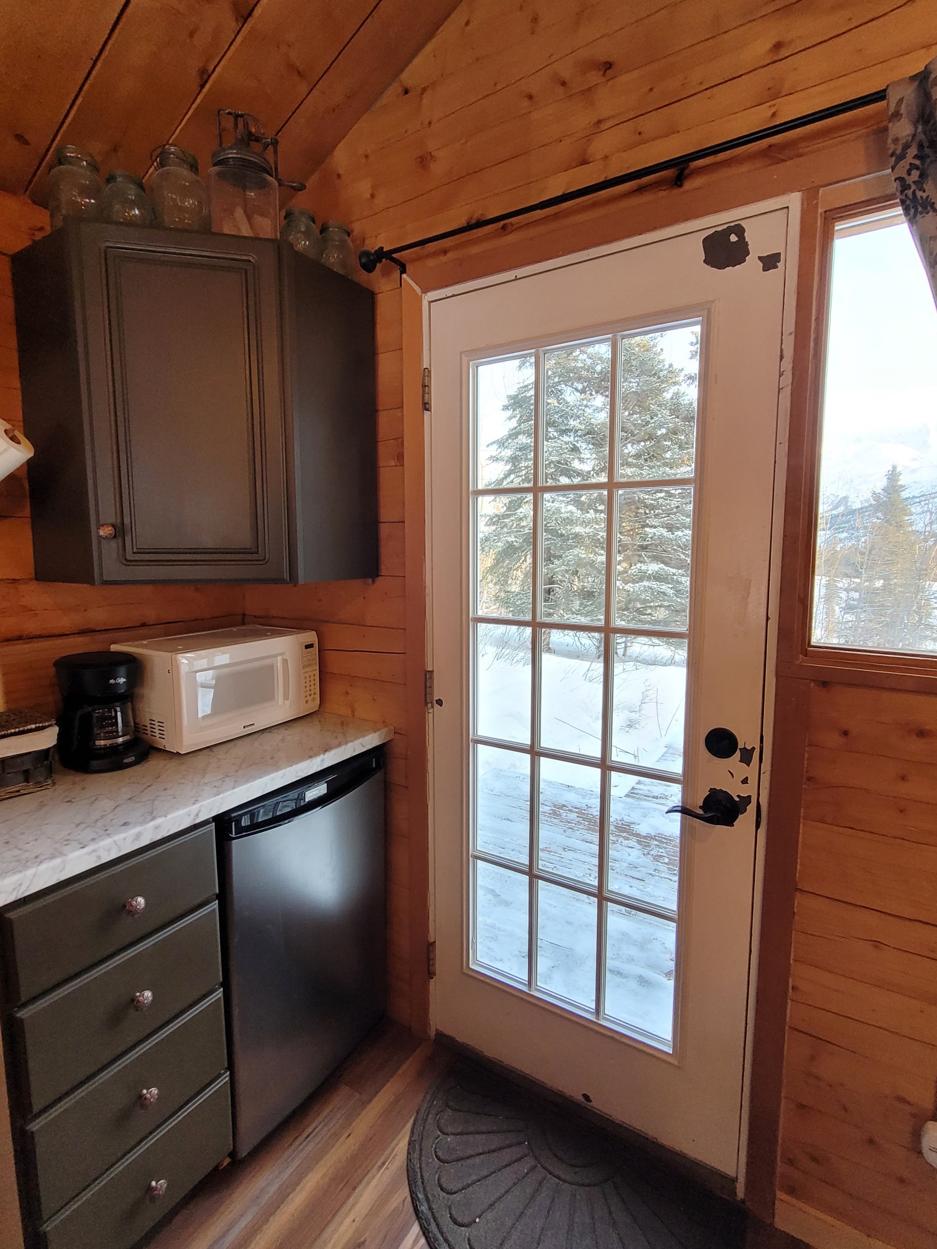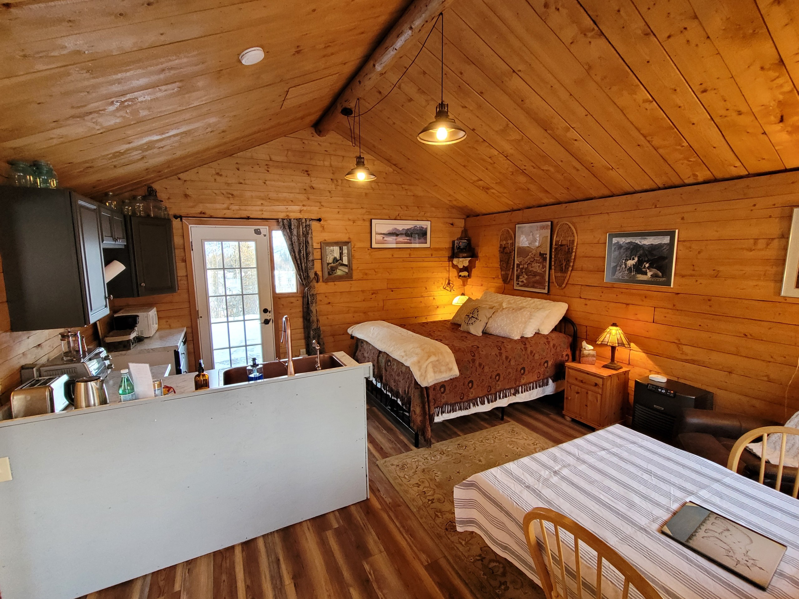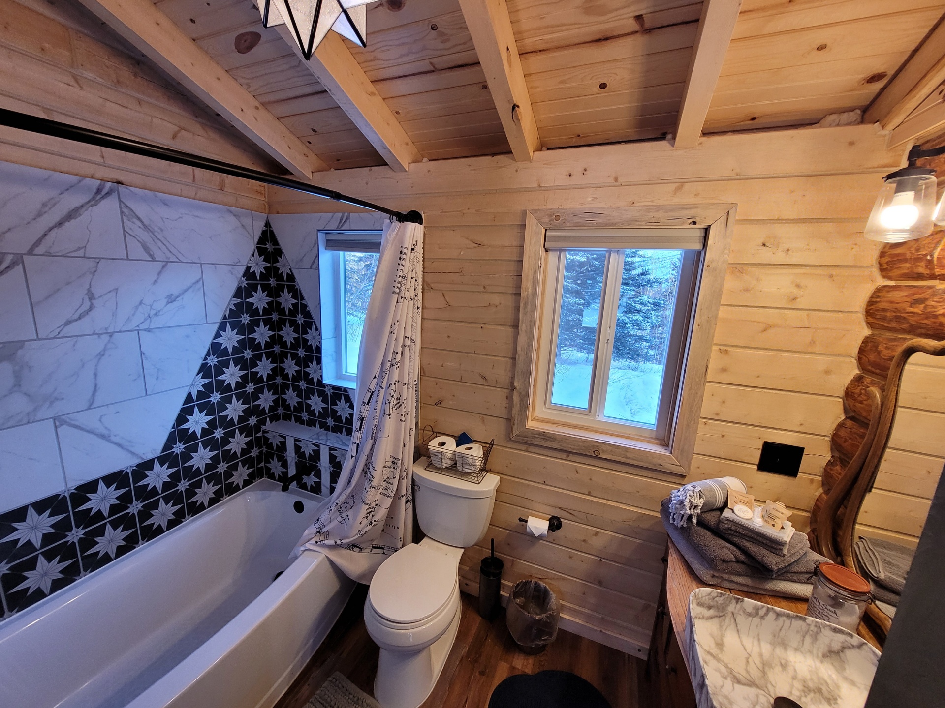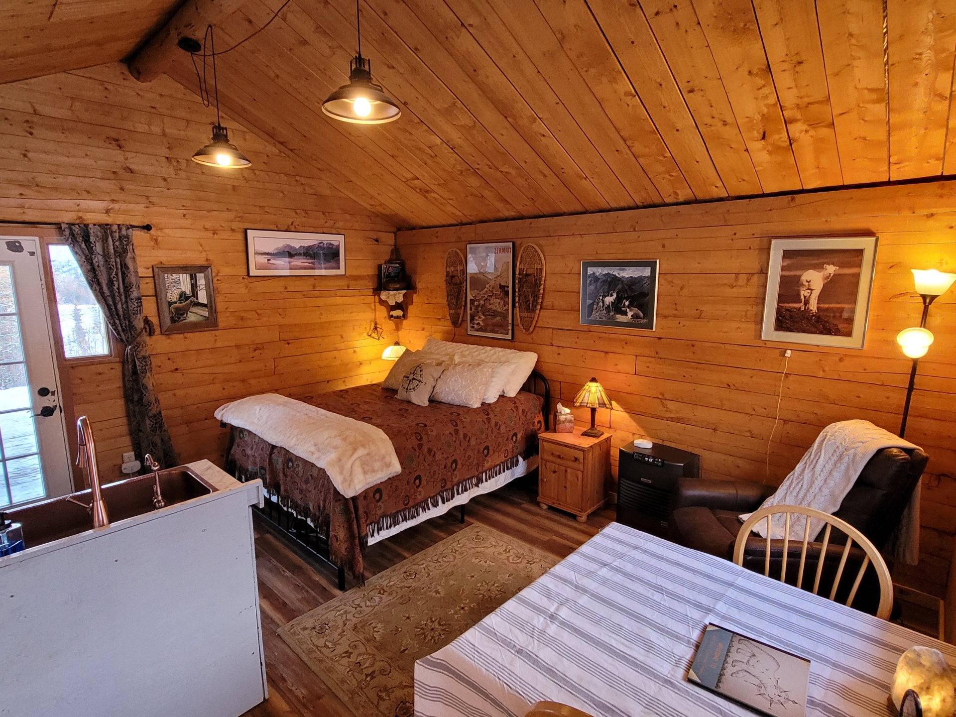 The Polaris has a fully equipped kitchen with a sink, reverse osmosis drinking water tap, microwave, mini fridge, propane cook stove and oven, dish-ware, utensils, and pots and pans. Enjoy the newly completed ensuite bathroom with shower and tub, flush toilet and vanity sink! Heated with a Toyo stove. Extra linens, blankets, and bath towels provided.