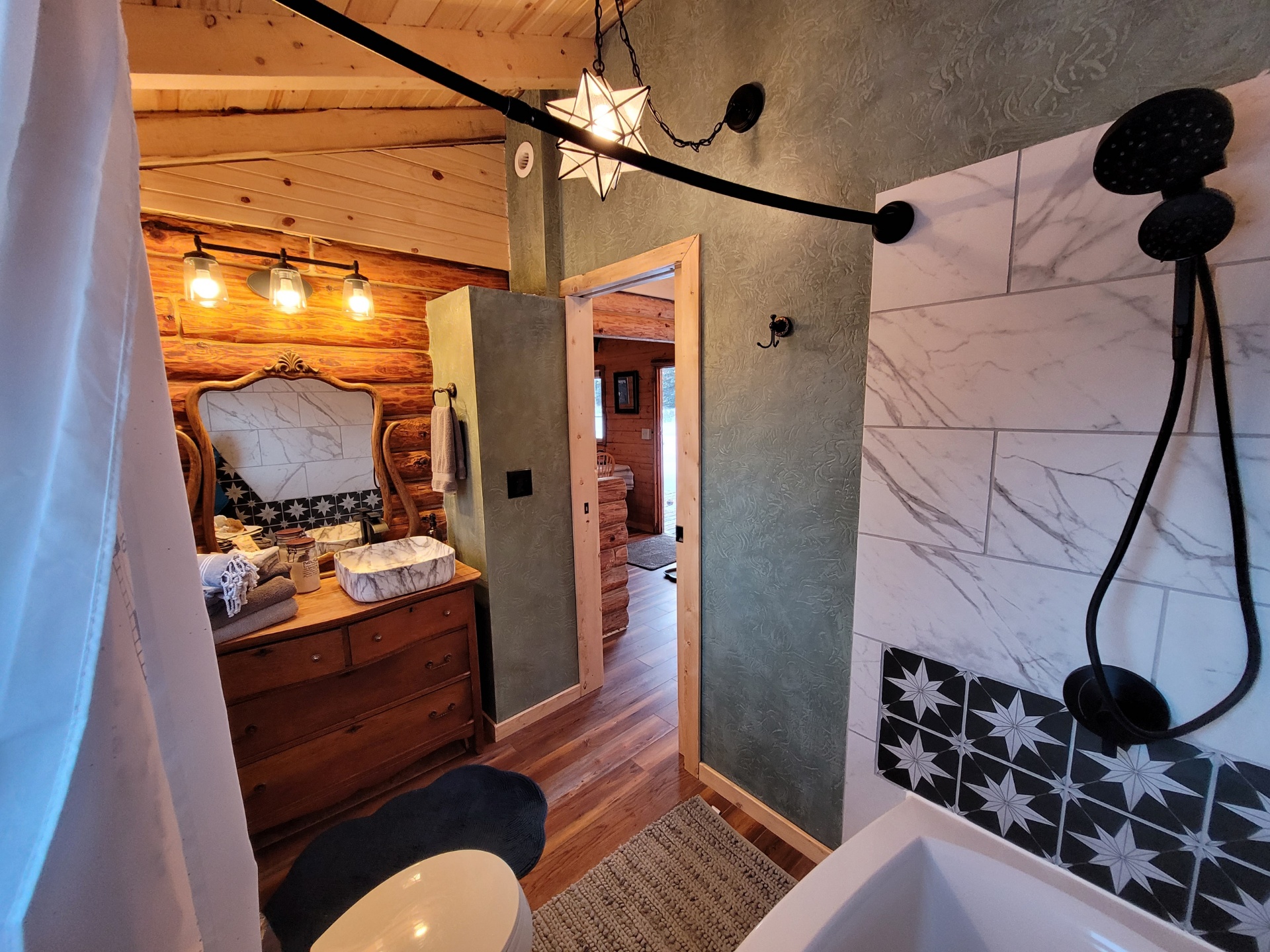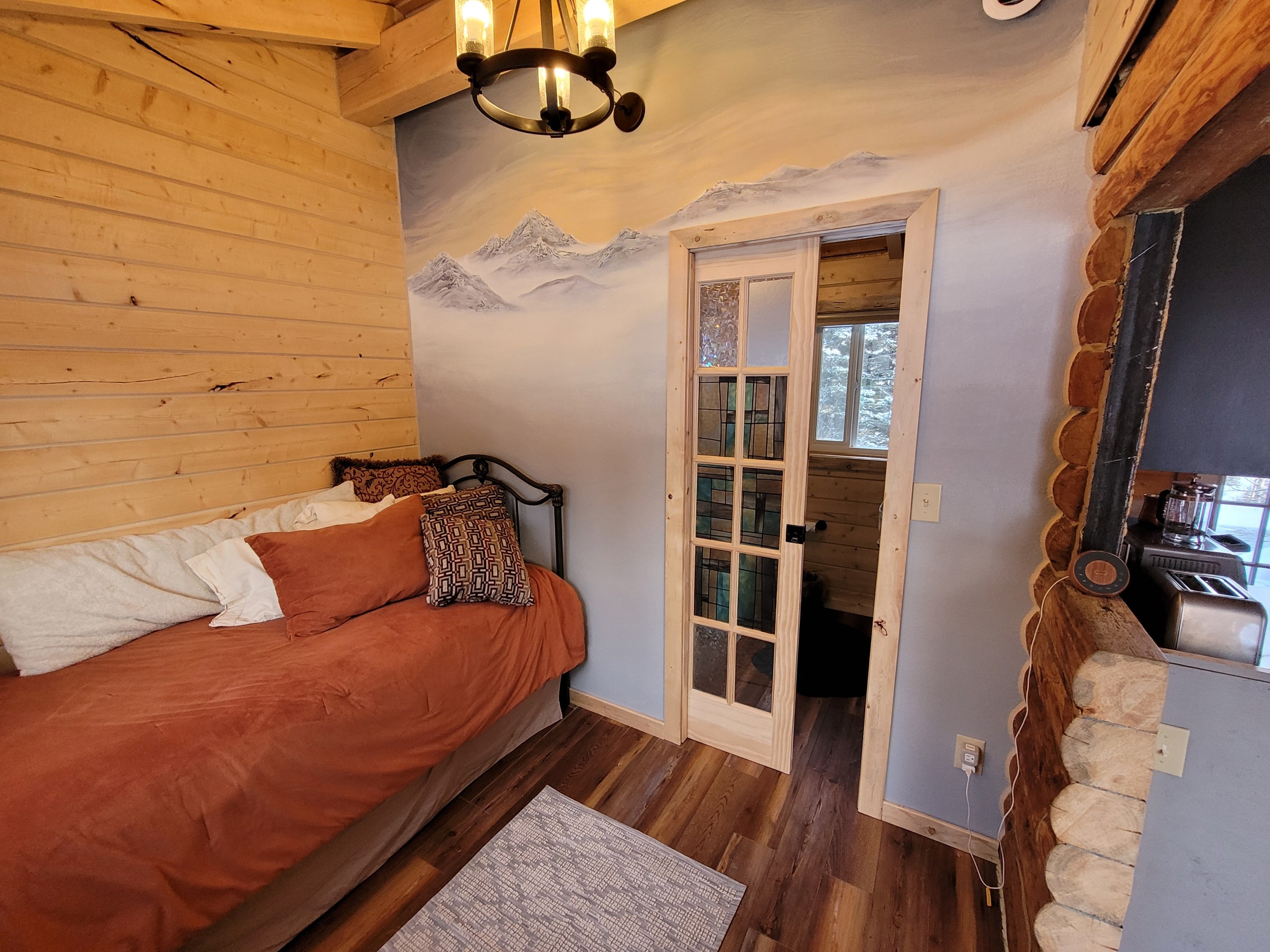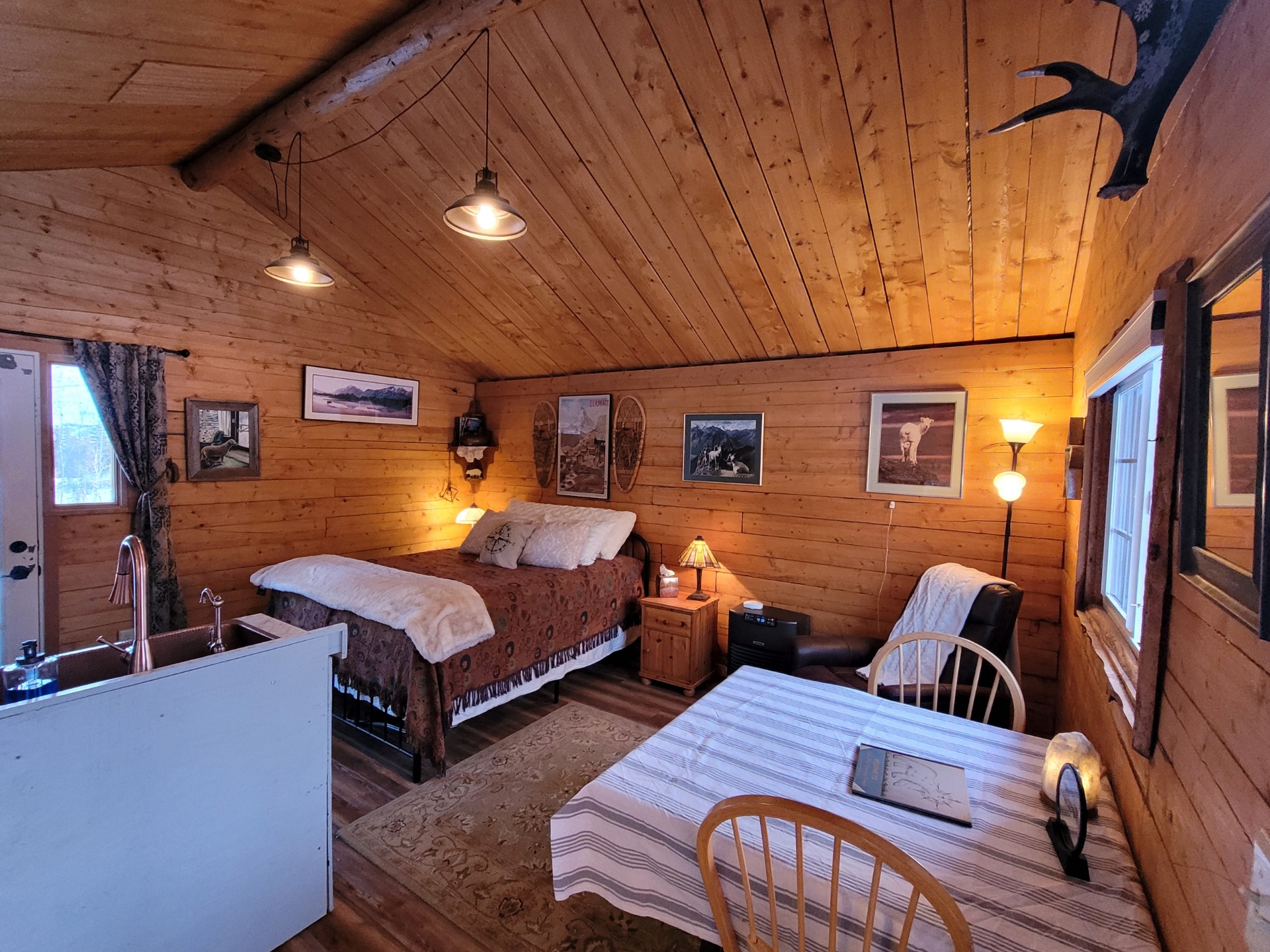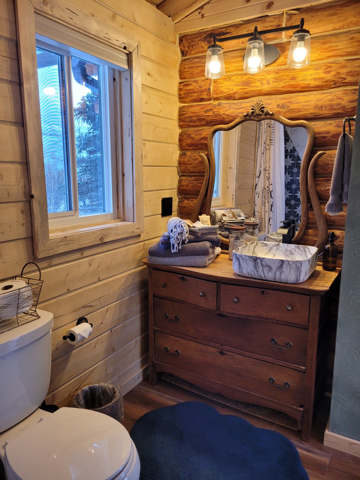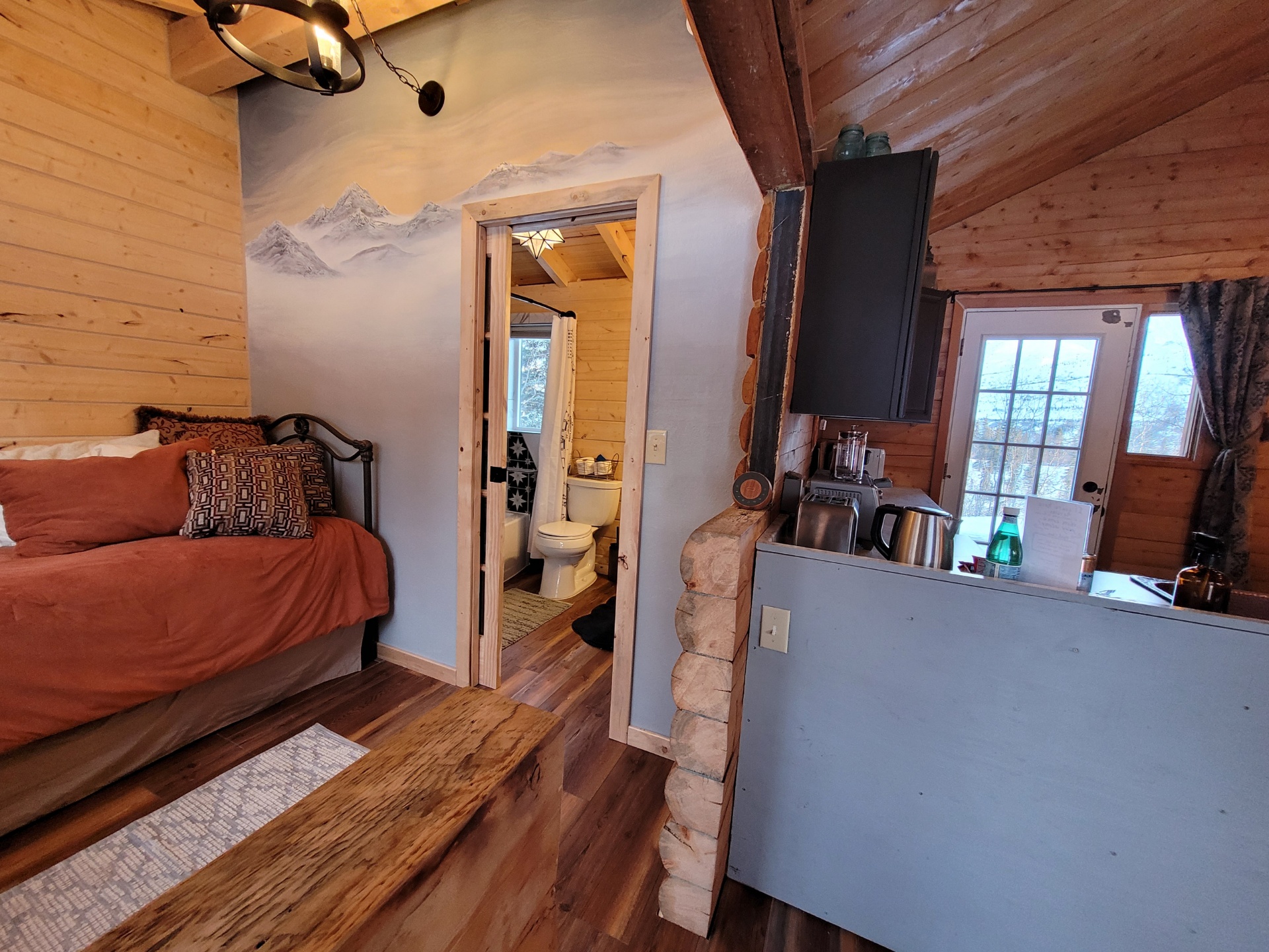 The Polaris has a fully equipped kitchen with a sink, reverse osmosis drinking water tap, microwave, mini fridge, propane cook stove and oven, dish-ware, utensils, and pots and pans. Enjoy the newly completed ensuite bathroom with shower and tub, flush toilet and vanity sink! Heated with a Toyo stove. Extra linens, blankets, and bath towels provided.