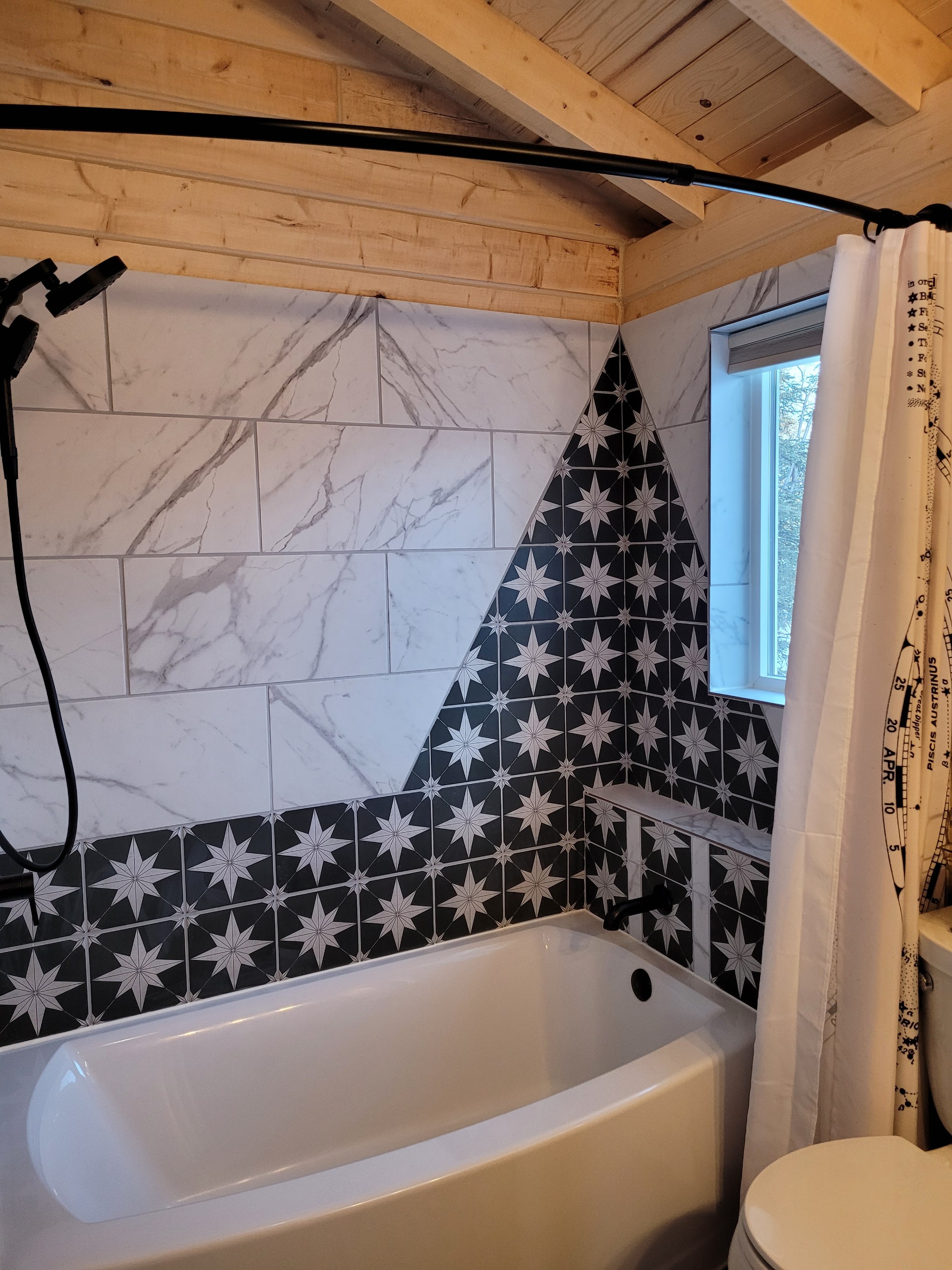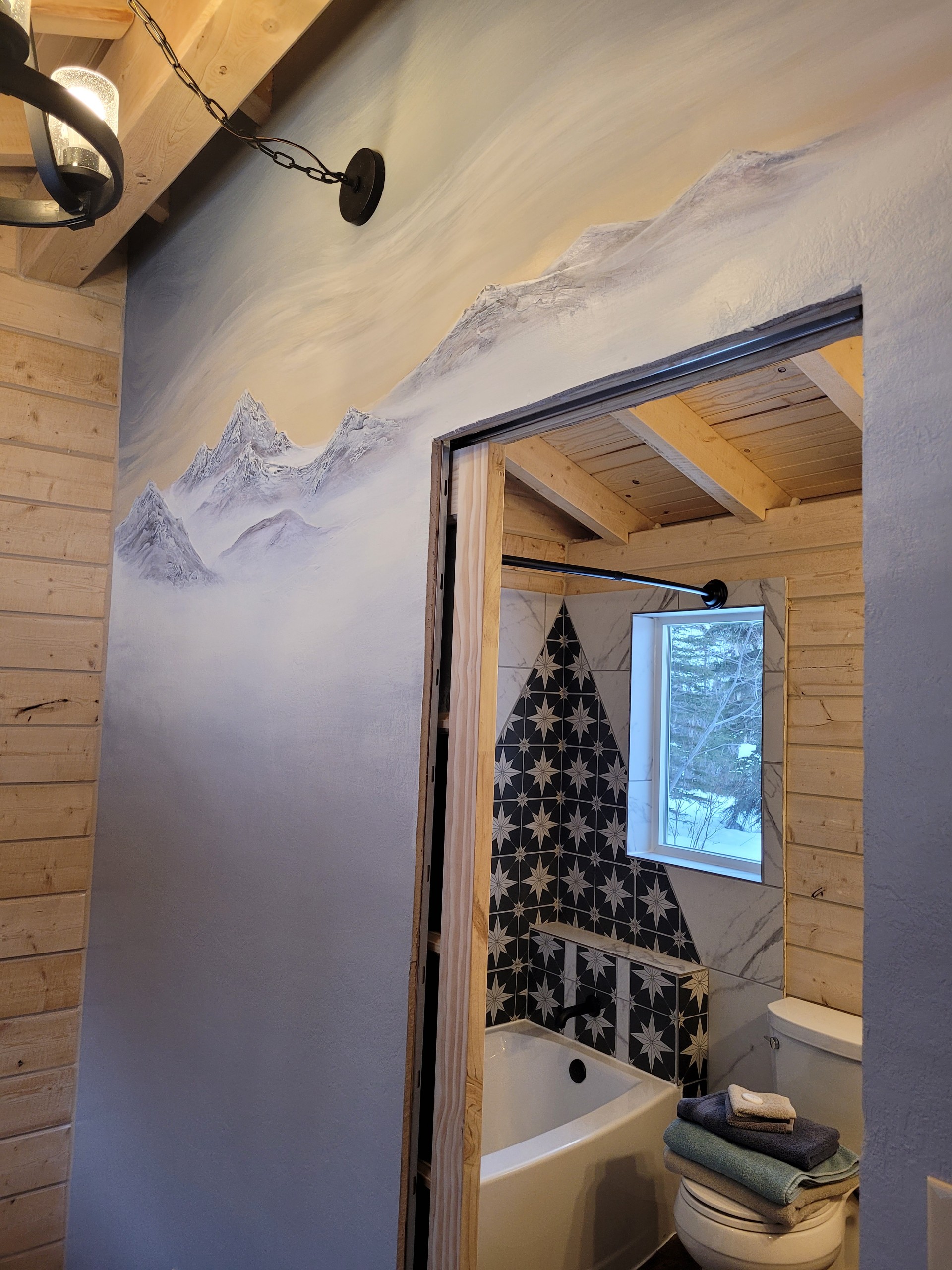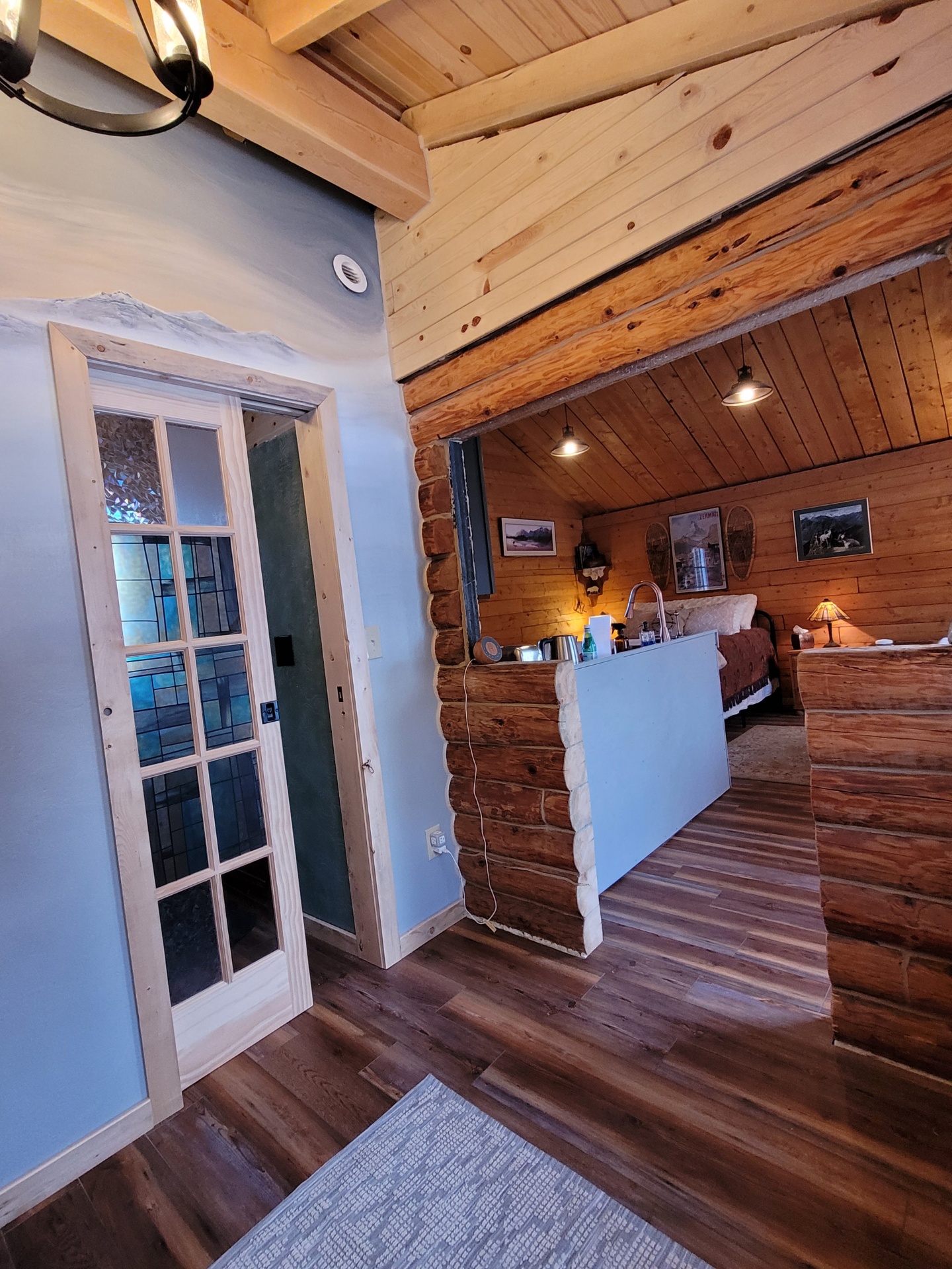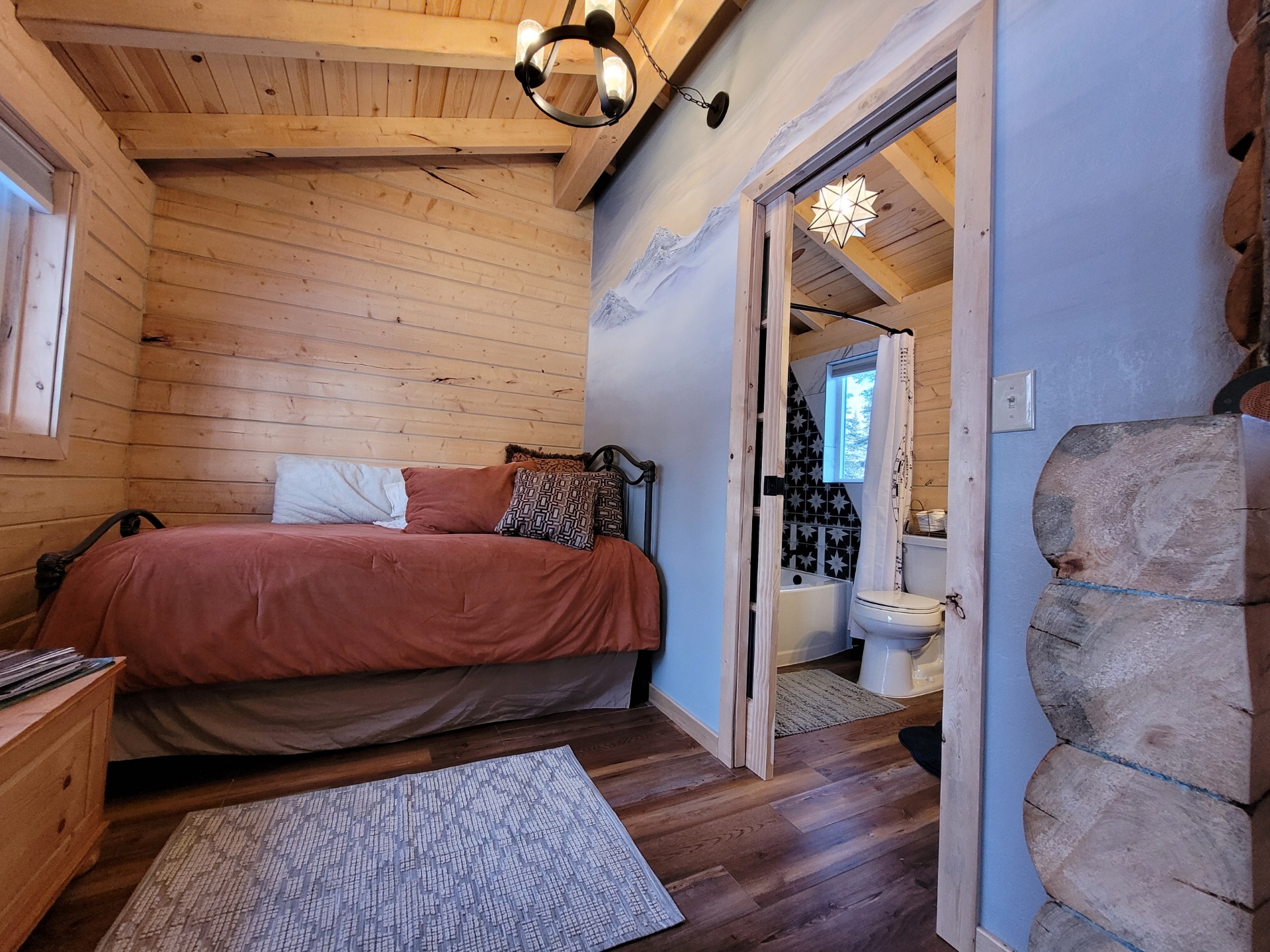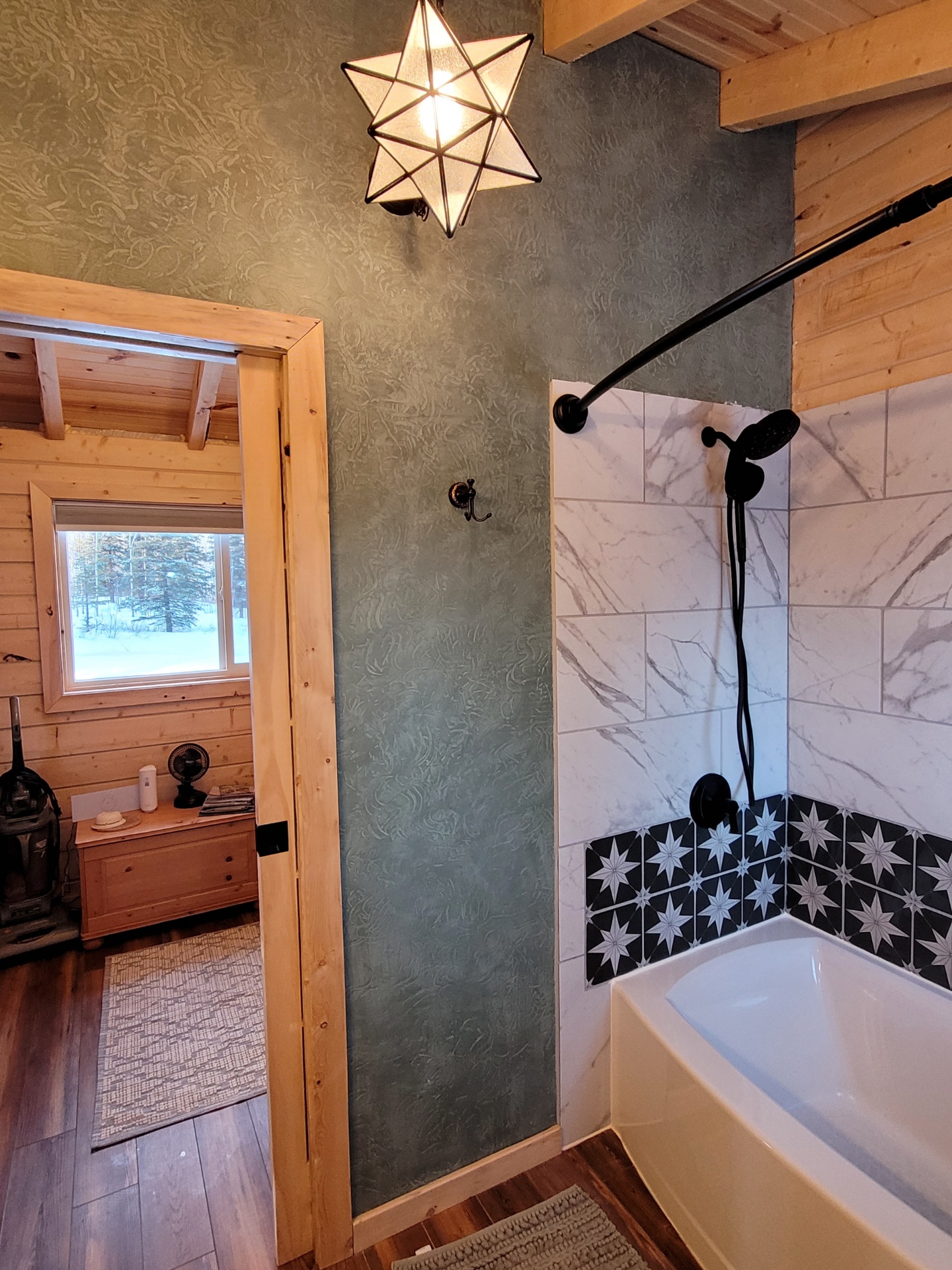 The Polaris has a fully equipped kitchen with a sink, reverse osmosis drinking water tap, microwave, mini fridge, propane cook stove and oven, dish-ware, utensils, and pots and pans. Enjoy the newly completed ensuite bathroom with shower and tub, flush toilet and vanity sink! Heated with a Toyo stove. Extra linens, blankets, and bath towels provided.