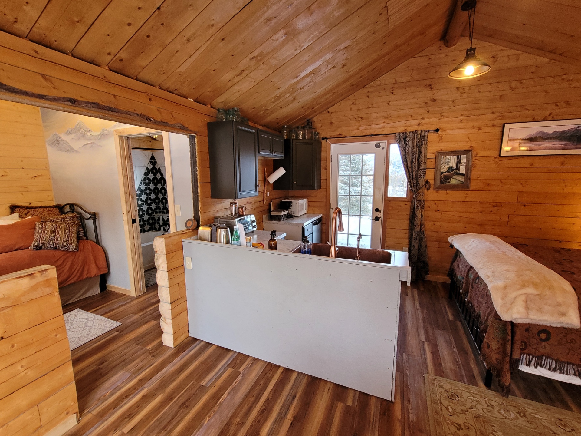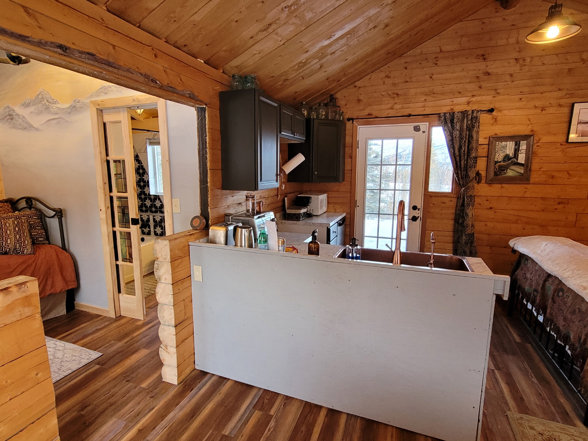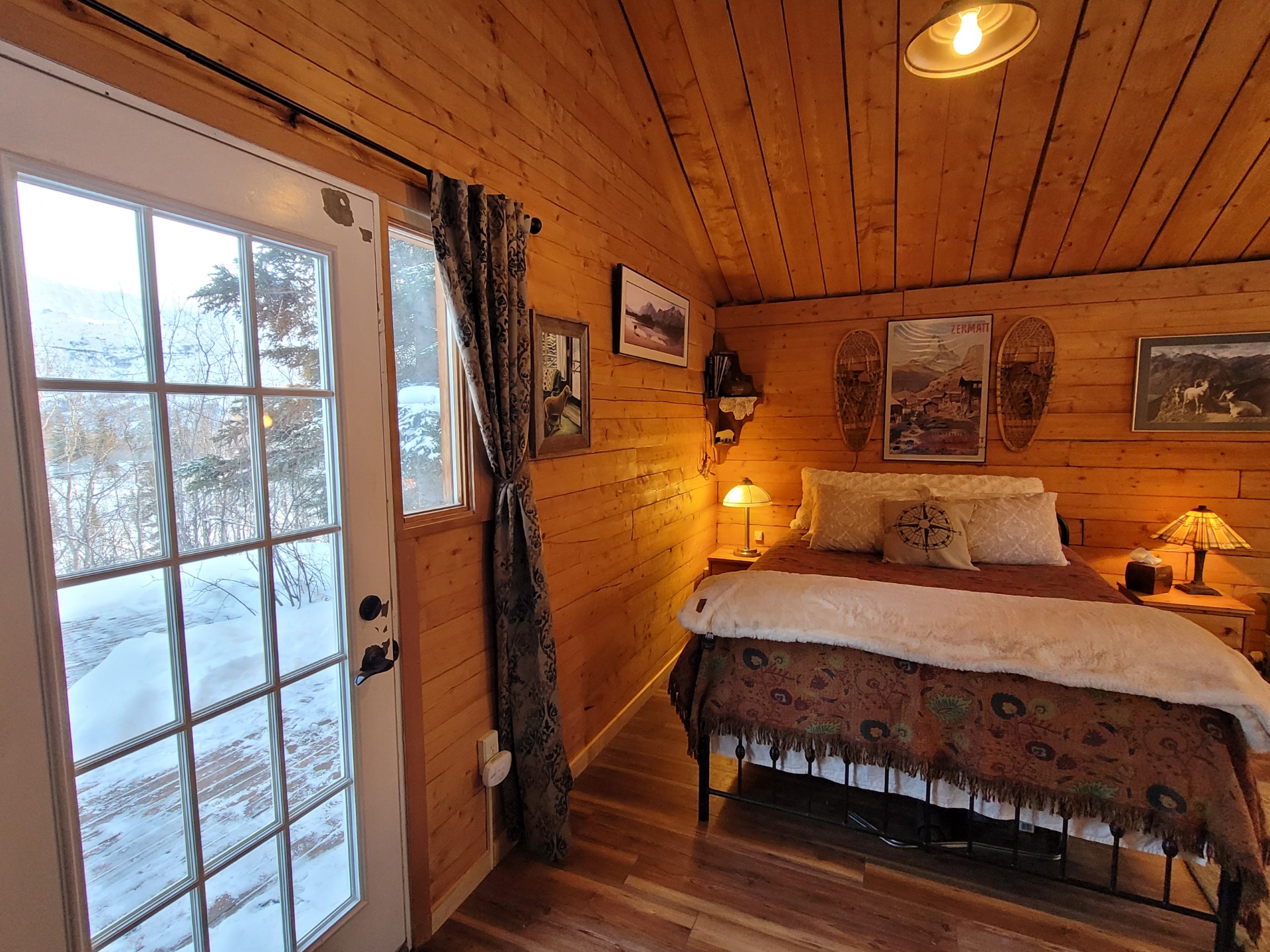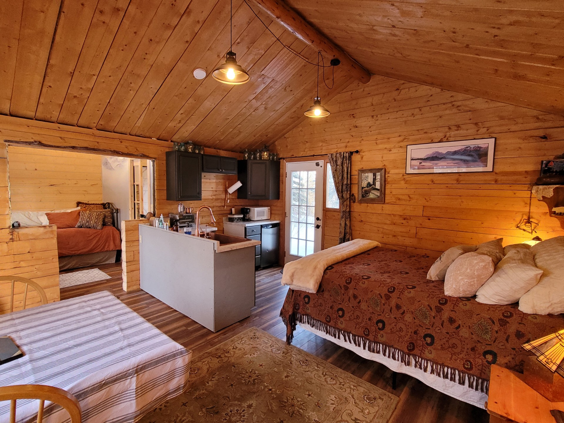 Nestled in a bed of wild flora, enjoy the spectacular views in every direction from your authentic hand built log cabin conveniently located 15 minutes from the Matanuska Glacier. This clean and cozy delight is a pet friendly accommodation. One Queen bed, one Twin, and an available/ fold-away cot furnish this cabin, with a front porch and back deck that look out to an unparalleled Chugach Mountain vista. Secluded and private, Polaris’s grounds are shared with only two other cabins; you also have access to a screened in pavillion with outdoor kitchen and campfire pit.