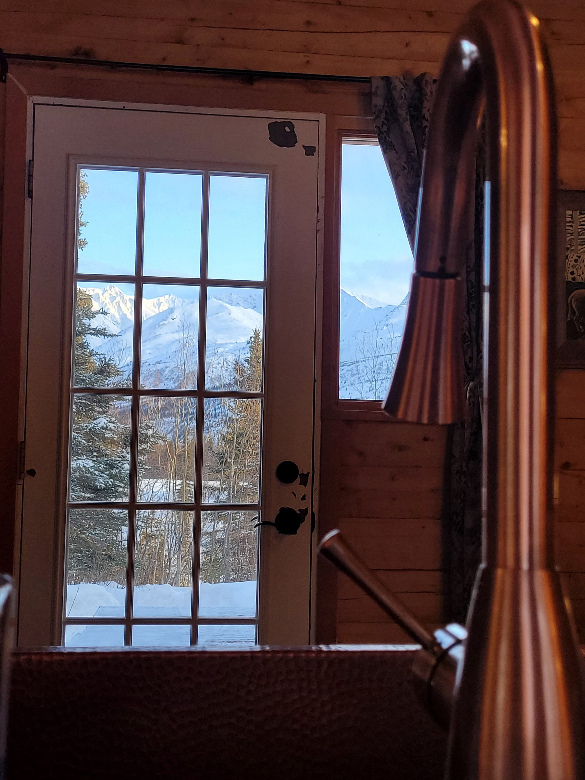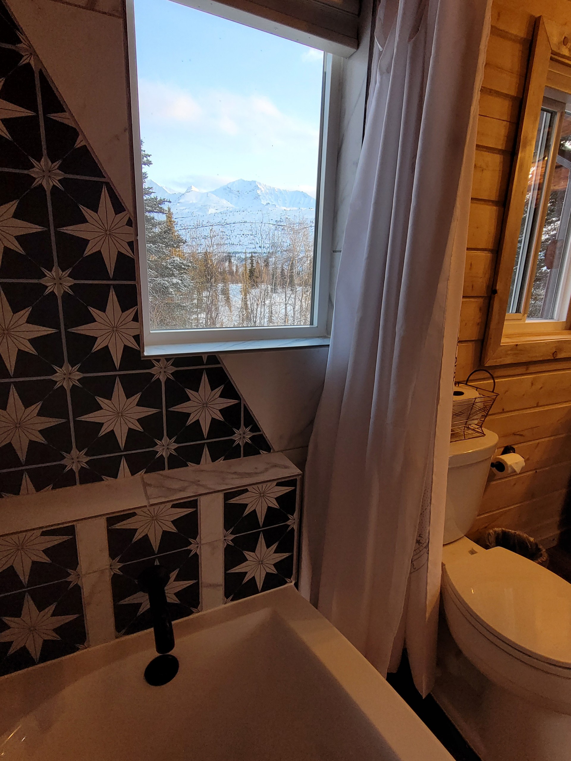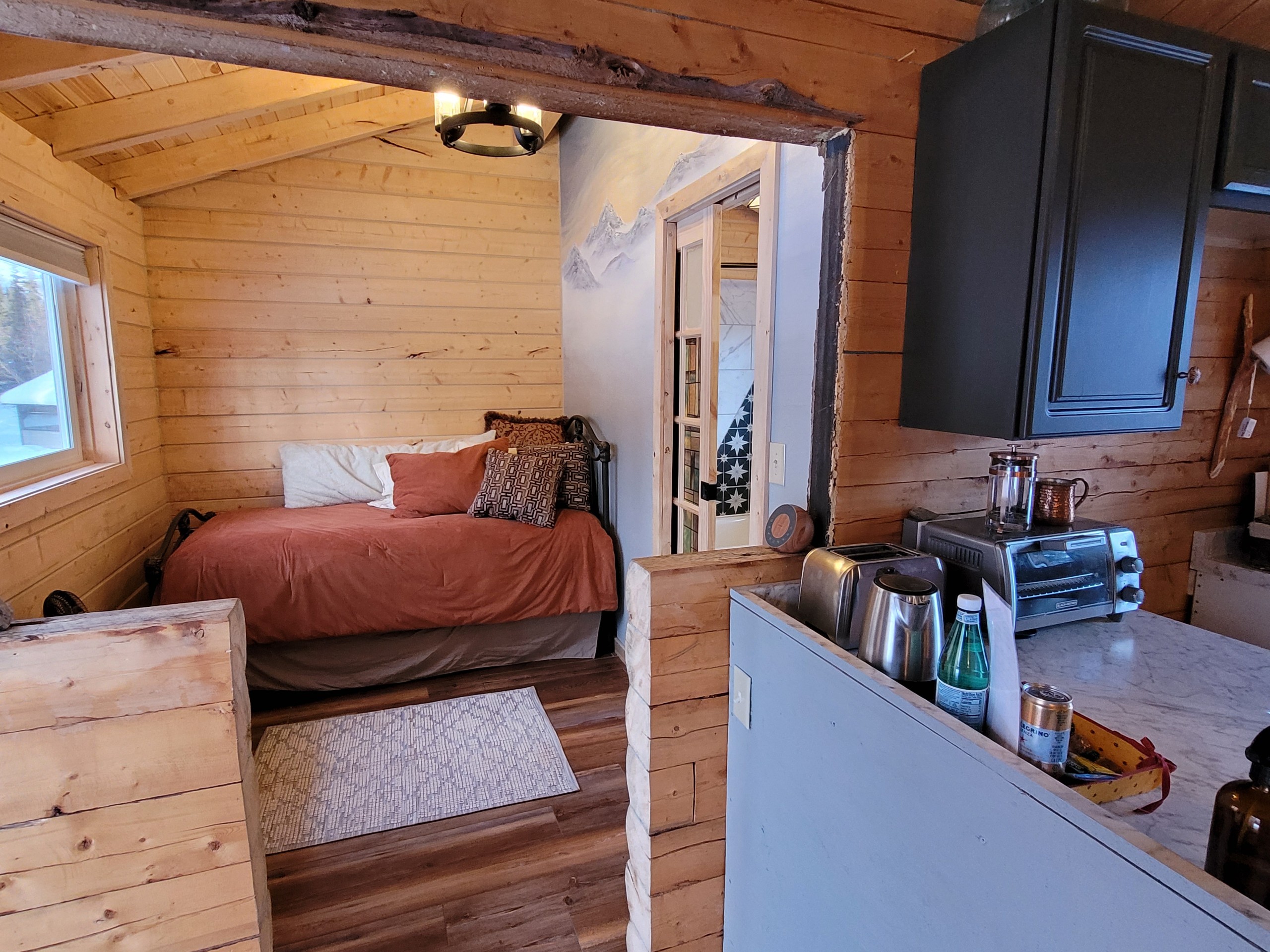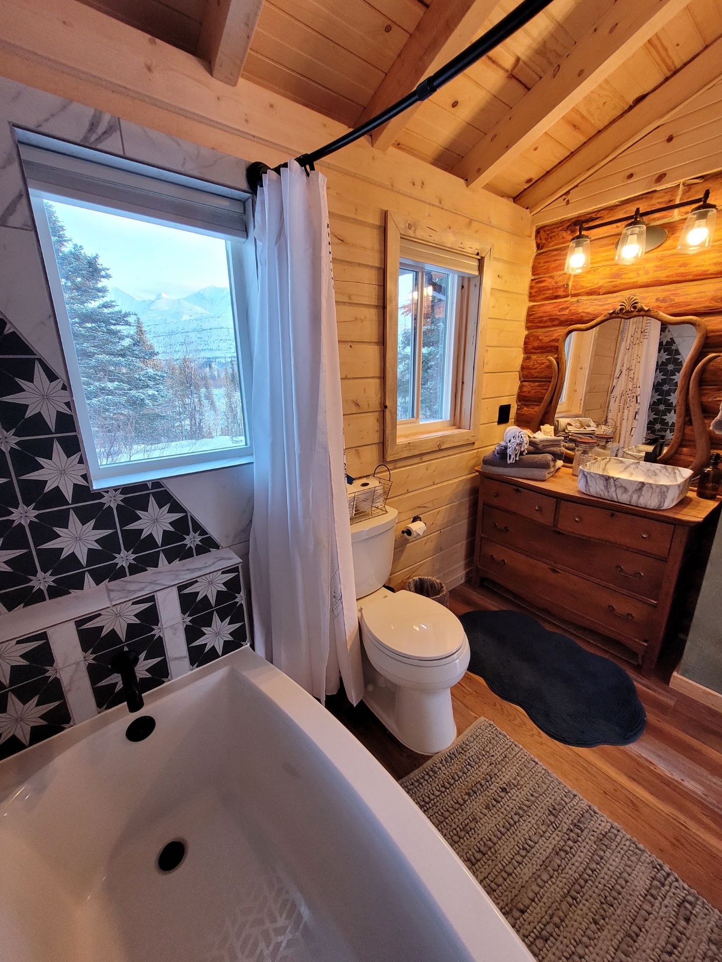 Nestled in a bed of wild flora, enjoy the spectacular views in every direction from your authentic hand built log cabin conveniently located 15 minutes from the Matanuska Glacier. This clean and cozy delight is a pet friendly accommodation. One Queen bed, one Twin, and an available/ fold-away cot furnish this cabin, with a front porch and back deck that look out to an unparalleled Chugach Mountain vista. Secluded and private, Polaris’s grounds are shared with only two other cabins; you also have access to a screened in pavillion with outdoor kitchen and campfire pit.